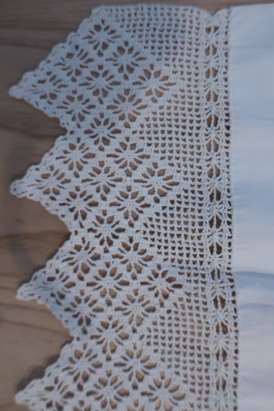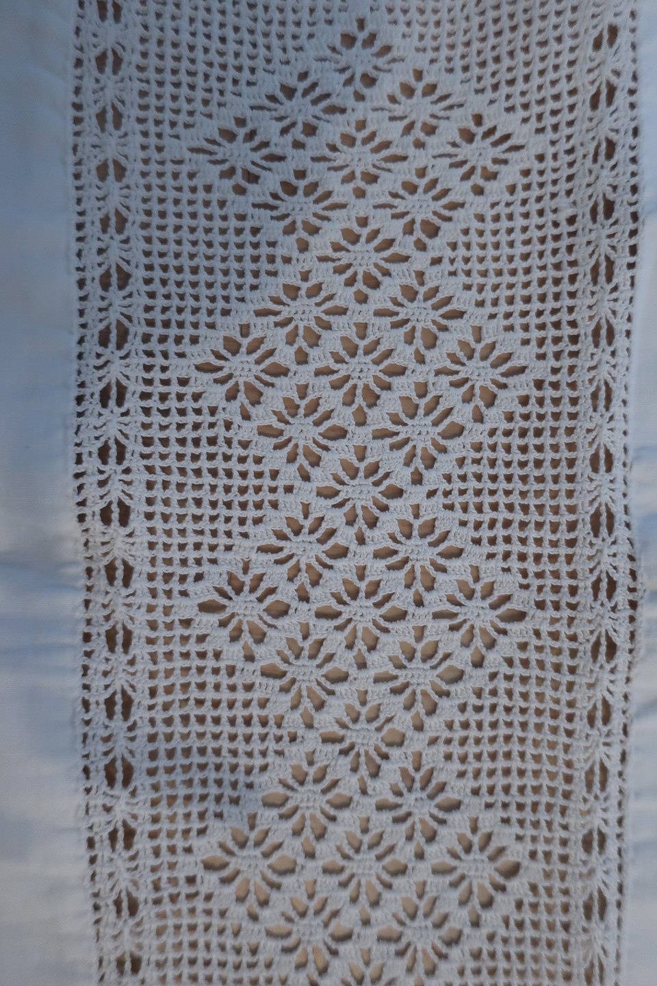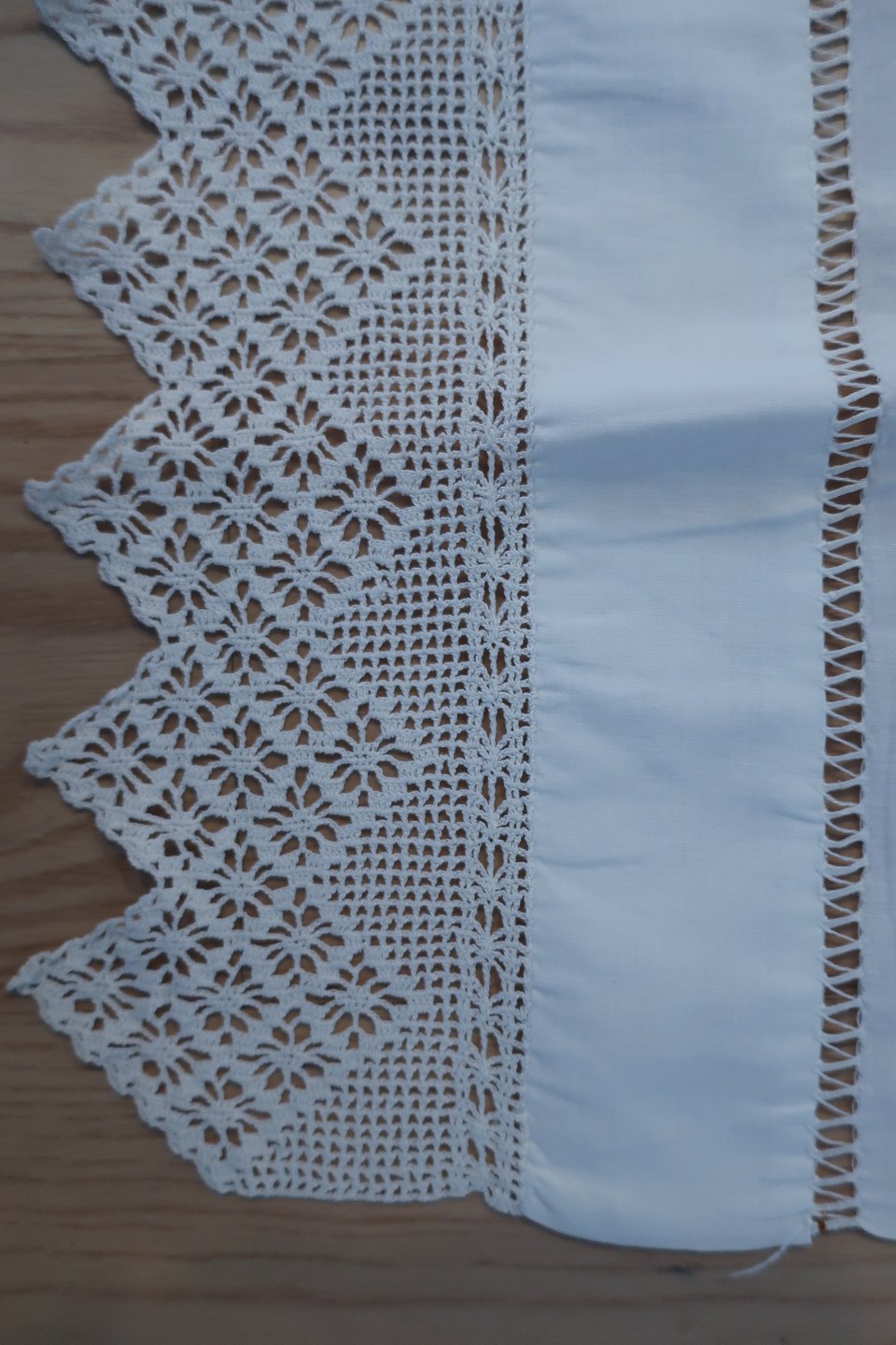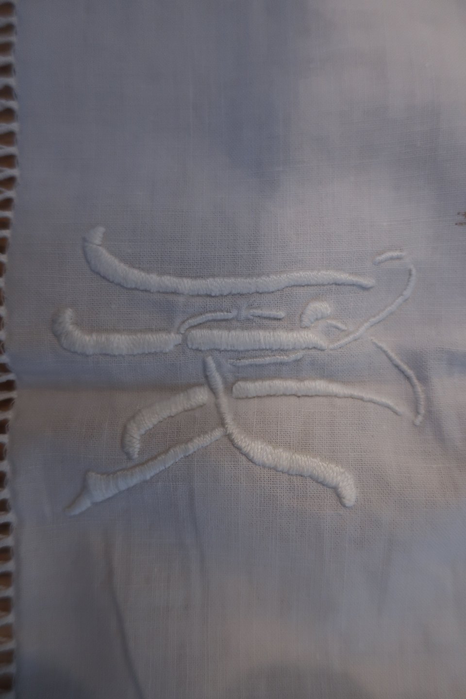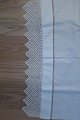 Smukt gammelt paradestykke med hvid håndhæklet bort m.m. og initialer