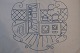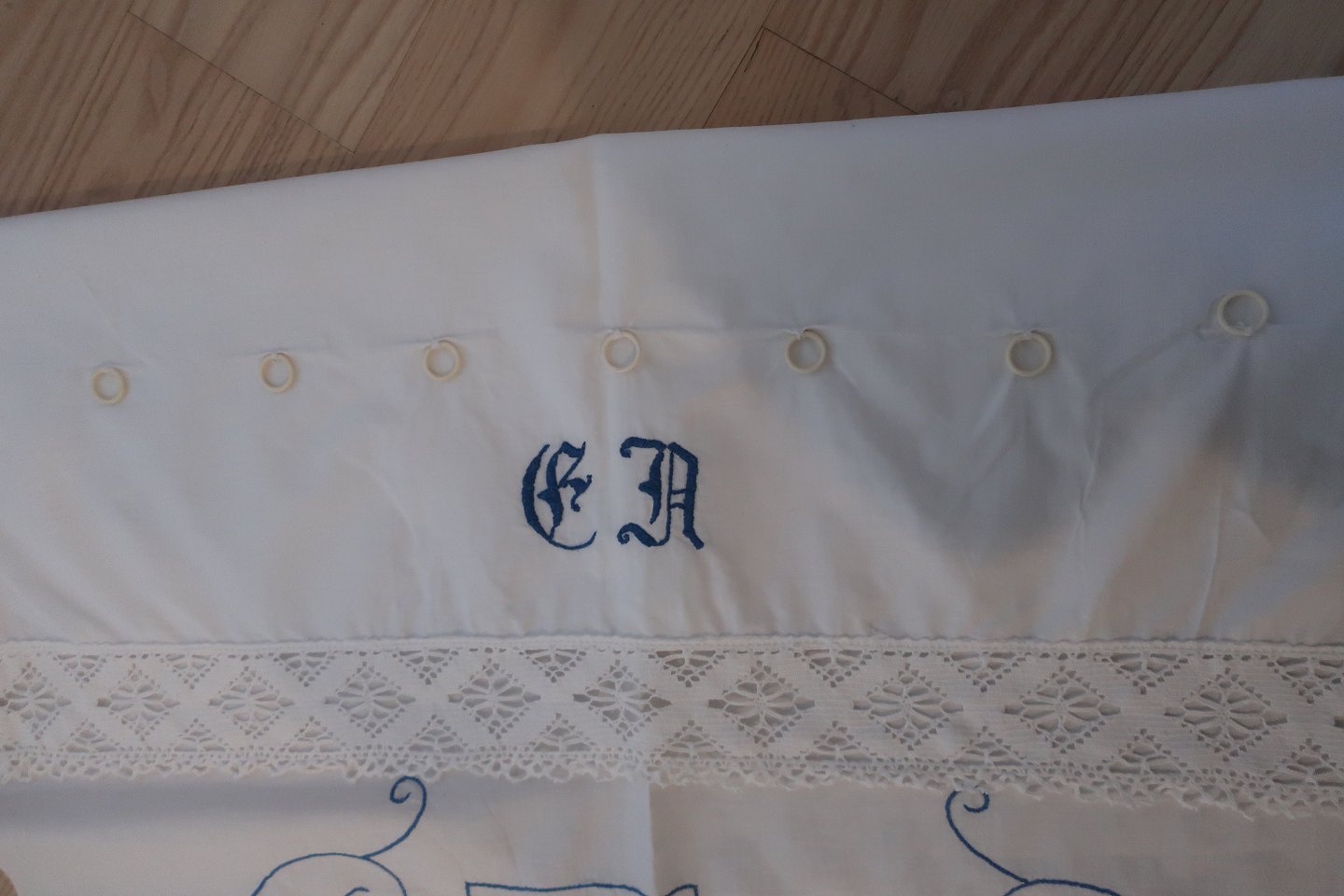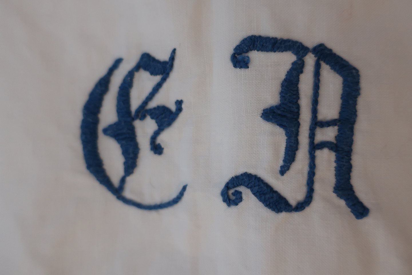 Smukt gammelt paradestykke med blåt håndbroderi og med initialer