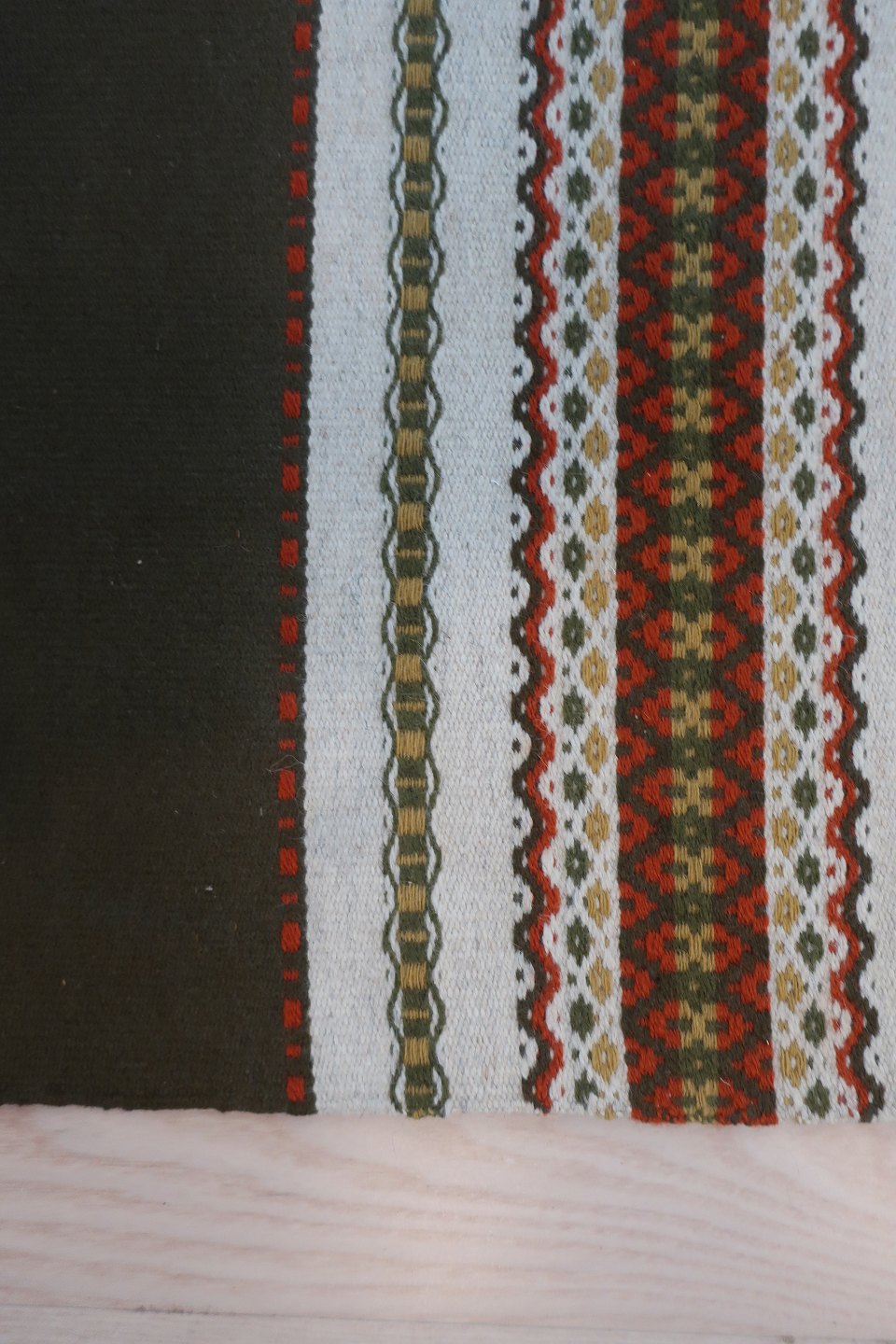 Gammel smuk bordløber, håndvævet af uld 99cm x 43cm Skønne farver God stand Vi har et godt udvalg af bordløbere, håndbroderede eller håndvævede Varenr.: LØ7