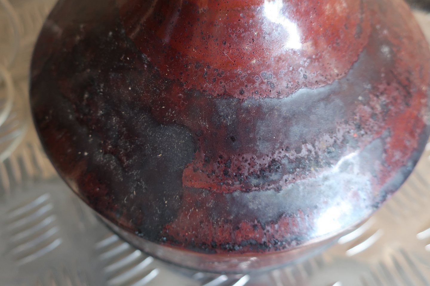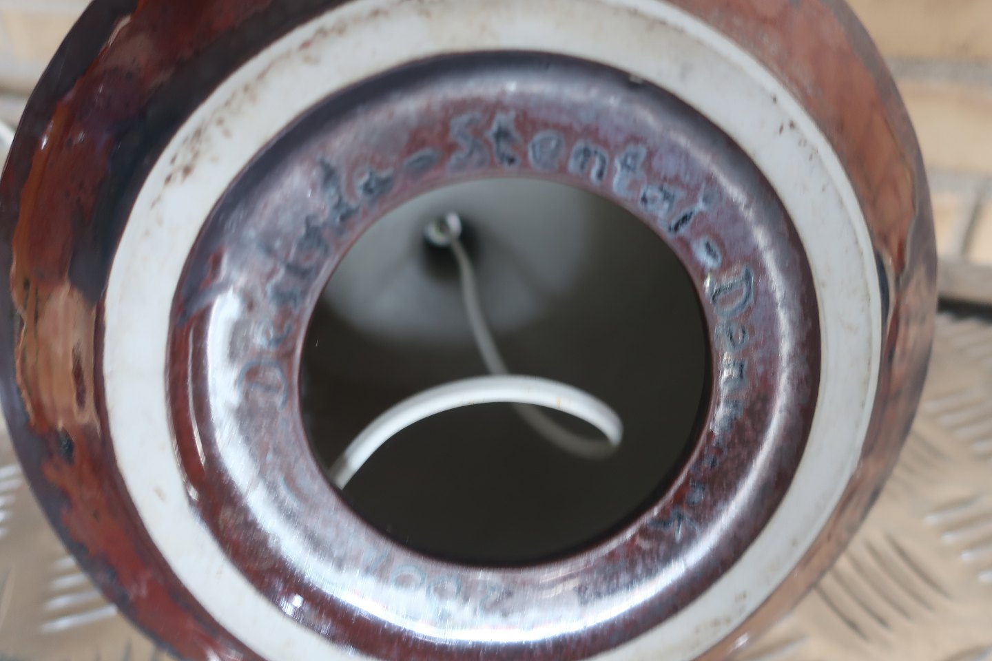 Retro bordlampe fra danske Desiree Meget smuk nuanceret farve i stentøjet Bordeaux / rødsort H: ca: 30,5cm Stempel: Desiree - Denmark - Stentøj - Denmark God stand Varenr.: SKA
