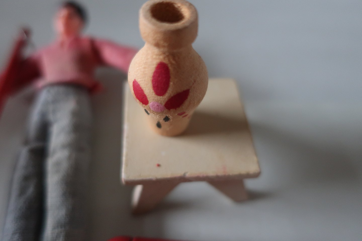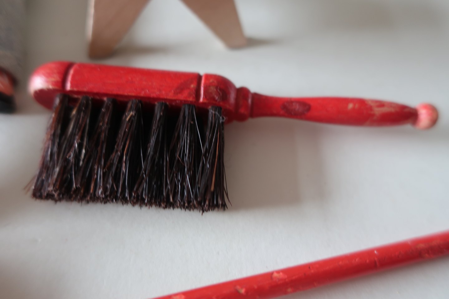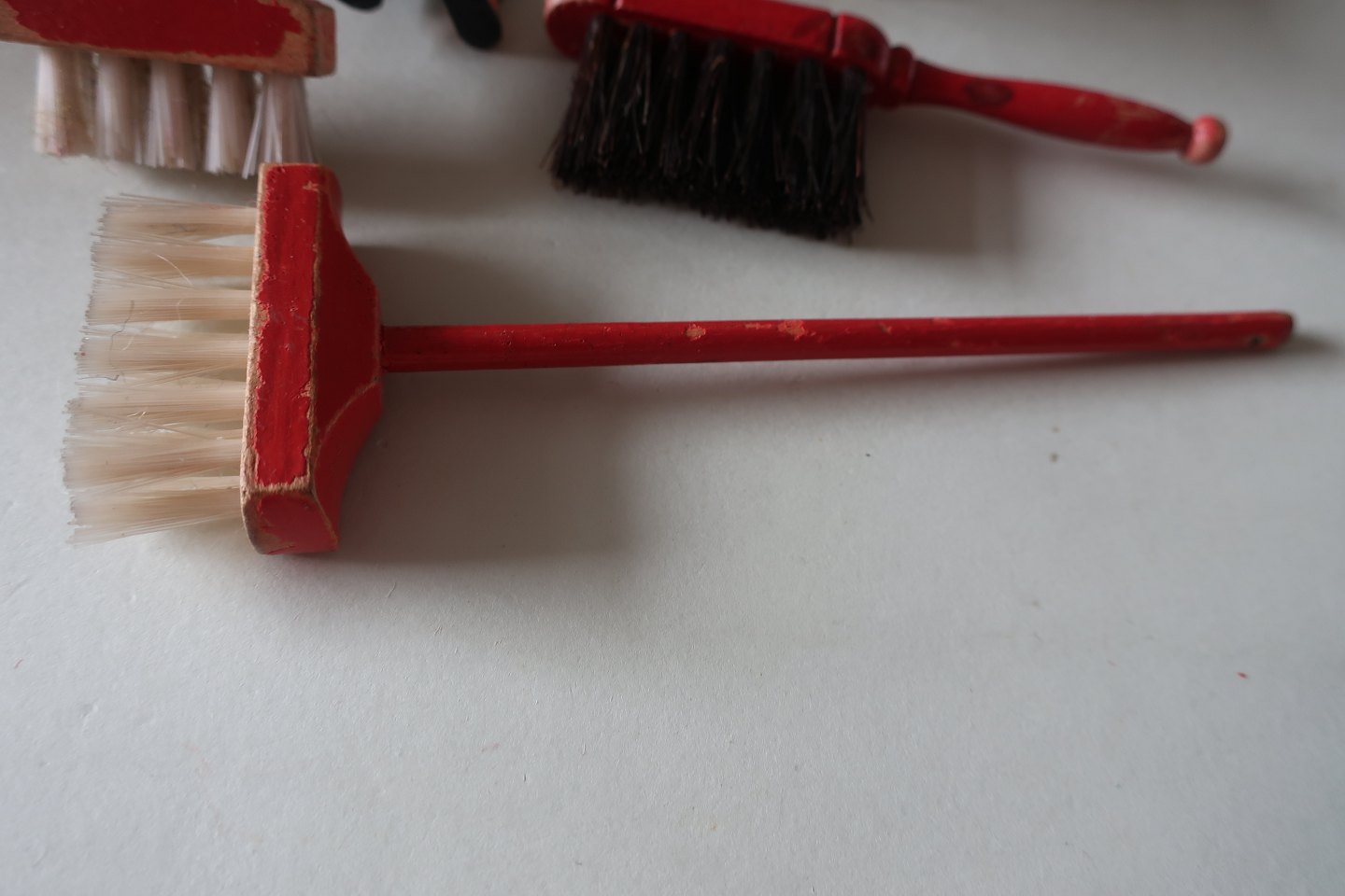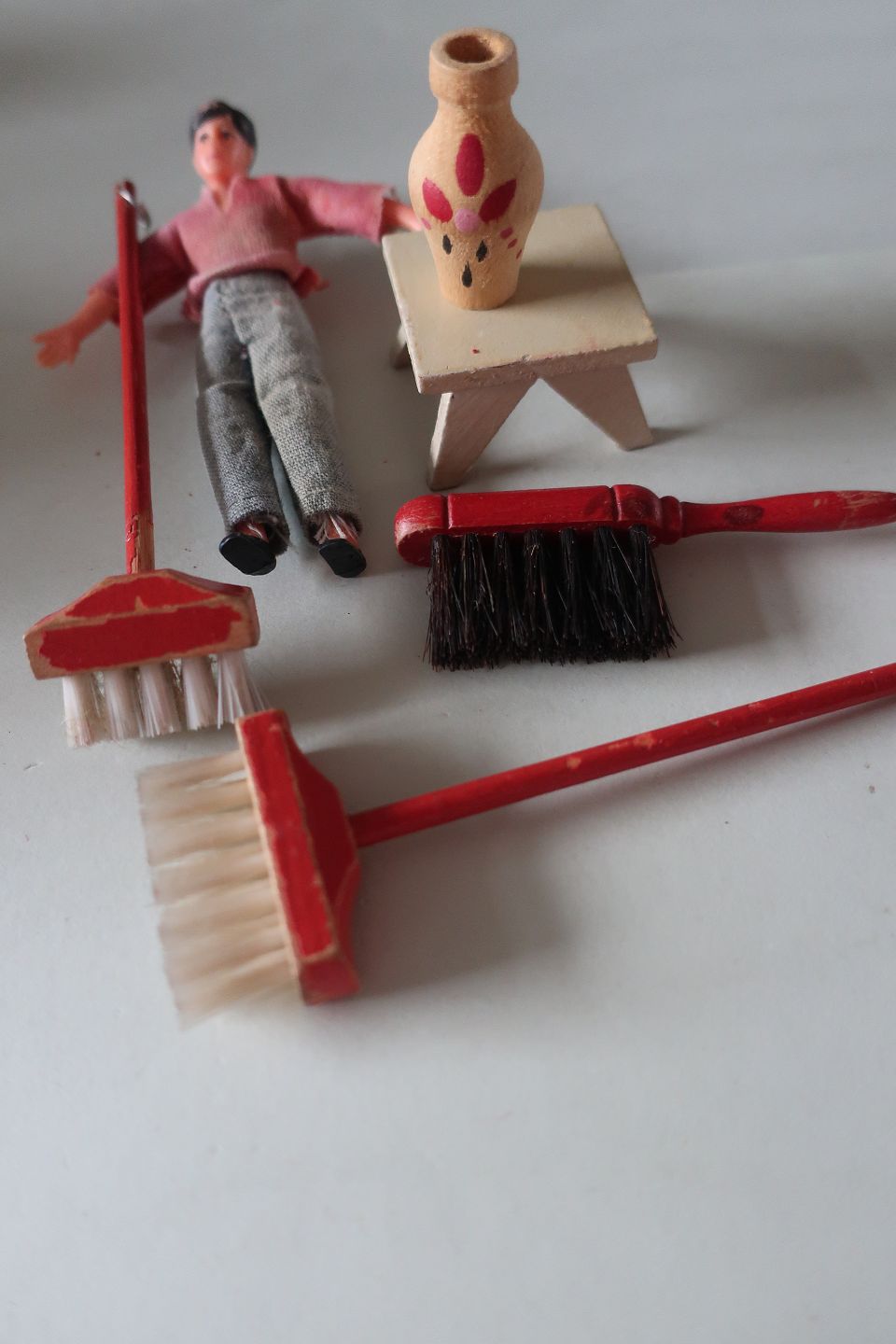 Bl.a. dukke, 3 koste inkl. en håndkost, vase og bænk/sofabord