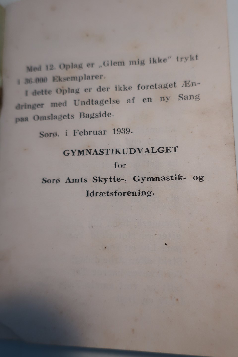 Glem mig ikke Sangbog for gymnaster Gymnastikudvalget for Sorø Amts Skytte-, Gymnastik- og Idrætsforening 1939 Sideantal: 66 God stand Varenr.: R2HY2