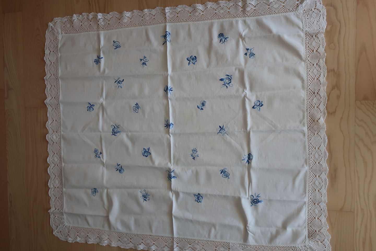 Gammel dug Håndbroderet med farvet broderi Passer smukt til Blå blomst-stellet eller musselmalet Ca. 137cm x 117cm God stand Varenr.: DG104-3-42401