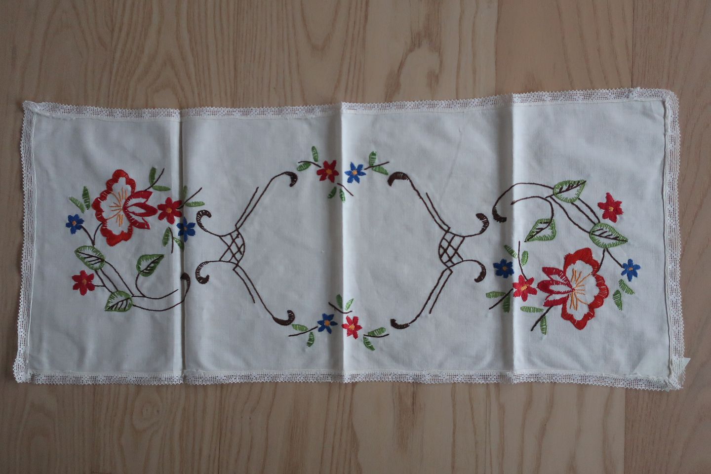 Old table cloth With embroidery in colours - made by hand About 60cm x 30cm In a good condition Articleno.: LŲ11-4-41892