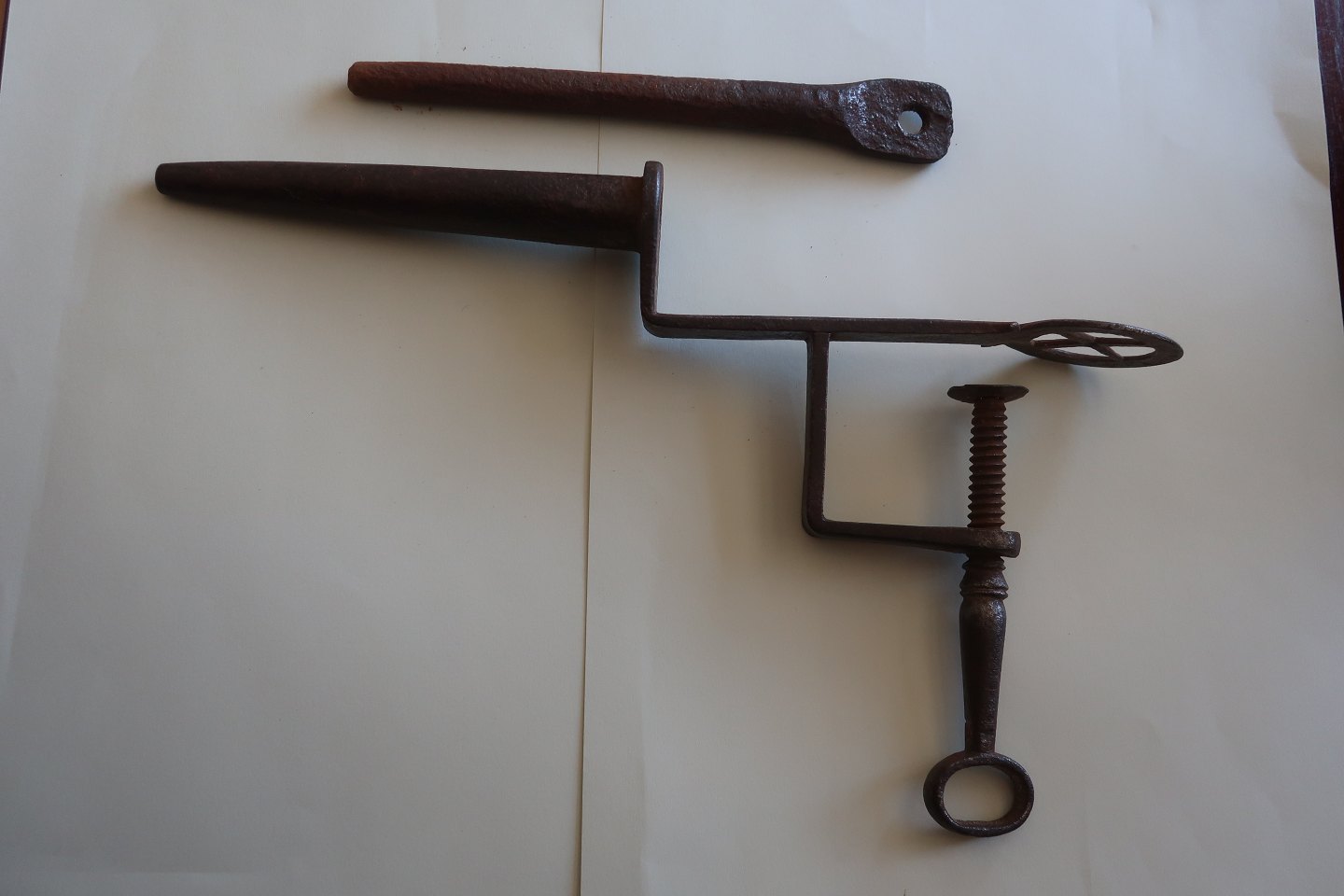 Dette pibejern har, som de antikke pibejern typisk havde, et lille cylinderformet rør, hvor den opvarmede jernbolt (se foto) stikkes ind.