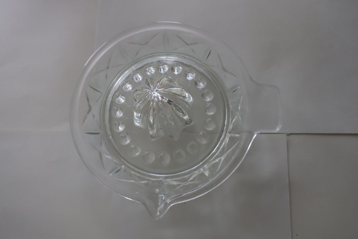 An old lemon squeezer made of glass Beautiful decorations One of the good old ones, which works good Diam.: 12,5cm In a good condition Articleno.: KM1006
